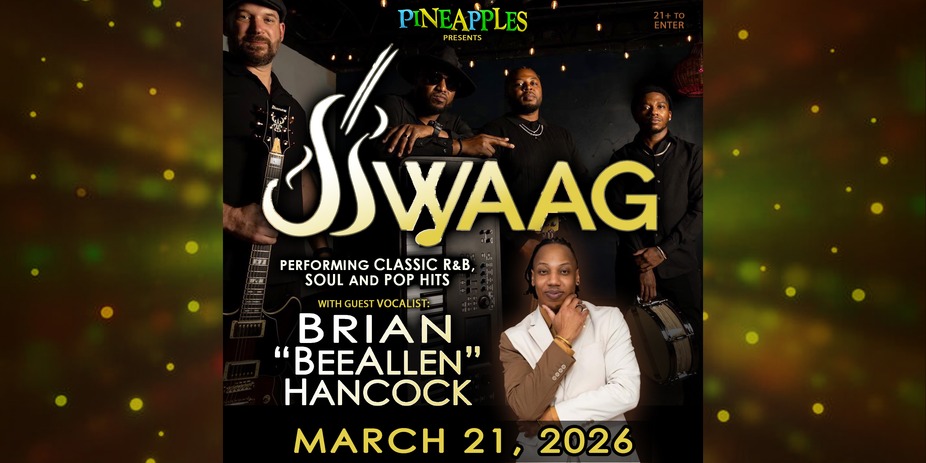 The talent packed SWAAG specializes in R&B, soul, and funk. Join us as they return to the Moon Room w/ professional vocalist Brian Hancock! Tickets available on Eventbrite.