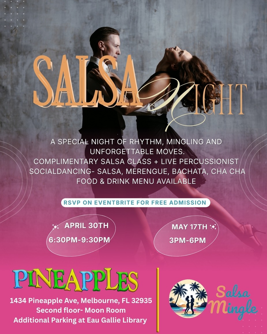 Come join us at Pineapples for a night filled with rhythm, fun, and lots of dancing! Salsa Mingle will be bringing their best moves to get everyone grooving on the dance floor. Whether you're a seasoned pro or a complete newbie, this event is perfect for anyone looking to shake it off and have a great time. Don't miss out on this opportunity to spice up your night with some hot salsa beats!
